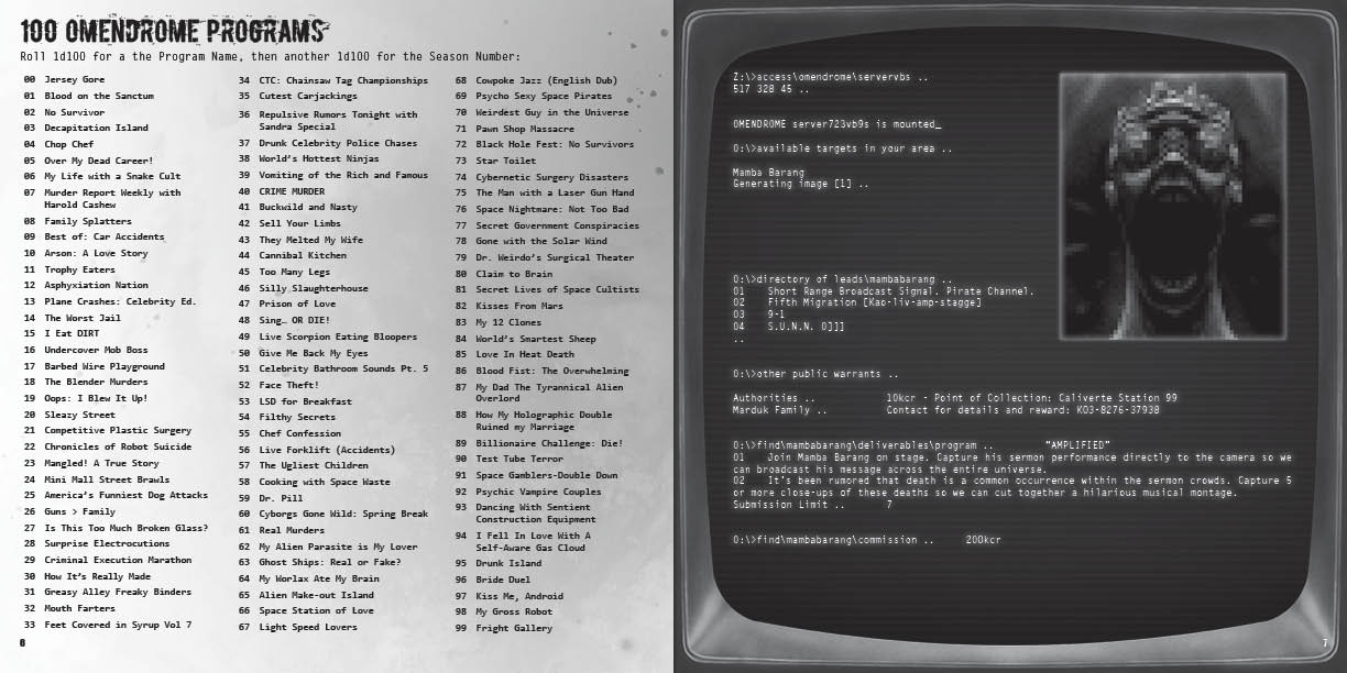 Also includes: Simplified ARKYVR rules, 100 Television Programs, TV Station Map, and Mothership Month '24 cross-over reference with "Not Enough Scoundrels" by ChrisAir.